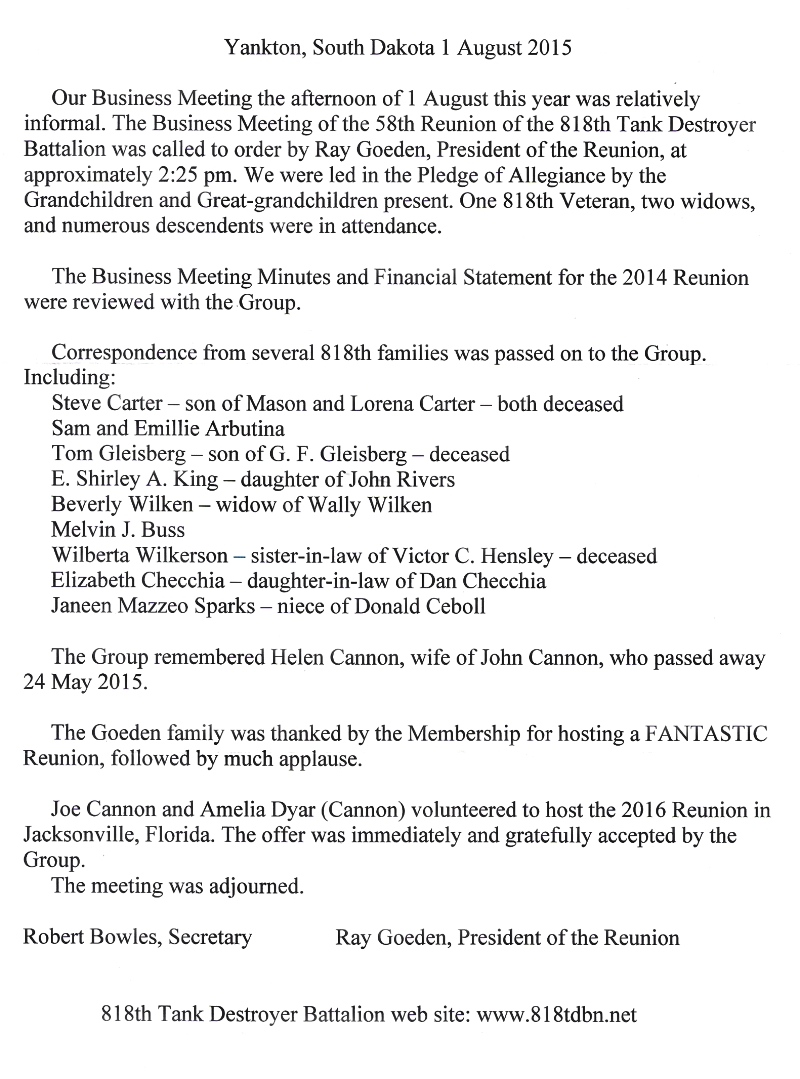 The 818th TD Bn group in Platte City, MO July 2019. back row L to R - Russell and Margaret Kreiser, Joan Pearson, Kimberly and Larry Hoagland, Sydnie Mahoney, Sharon Bowles, Cliff Alexander, Cody Parrish, Theresa and Jim Mahoney. front row L to R - Phil Bentley, Donna Alexander, Jan Bentley, Chuck Alexander, John Cannon Jr., Robert Bowles, Ken Bennett, Christopher Hauth. 2015 Reunion - Yankton SD2015 Reunion Business Meeting Minutes
